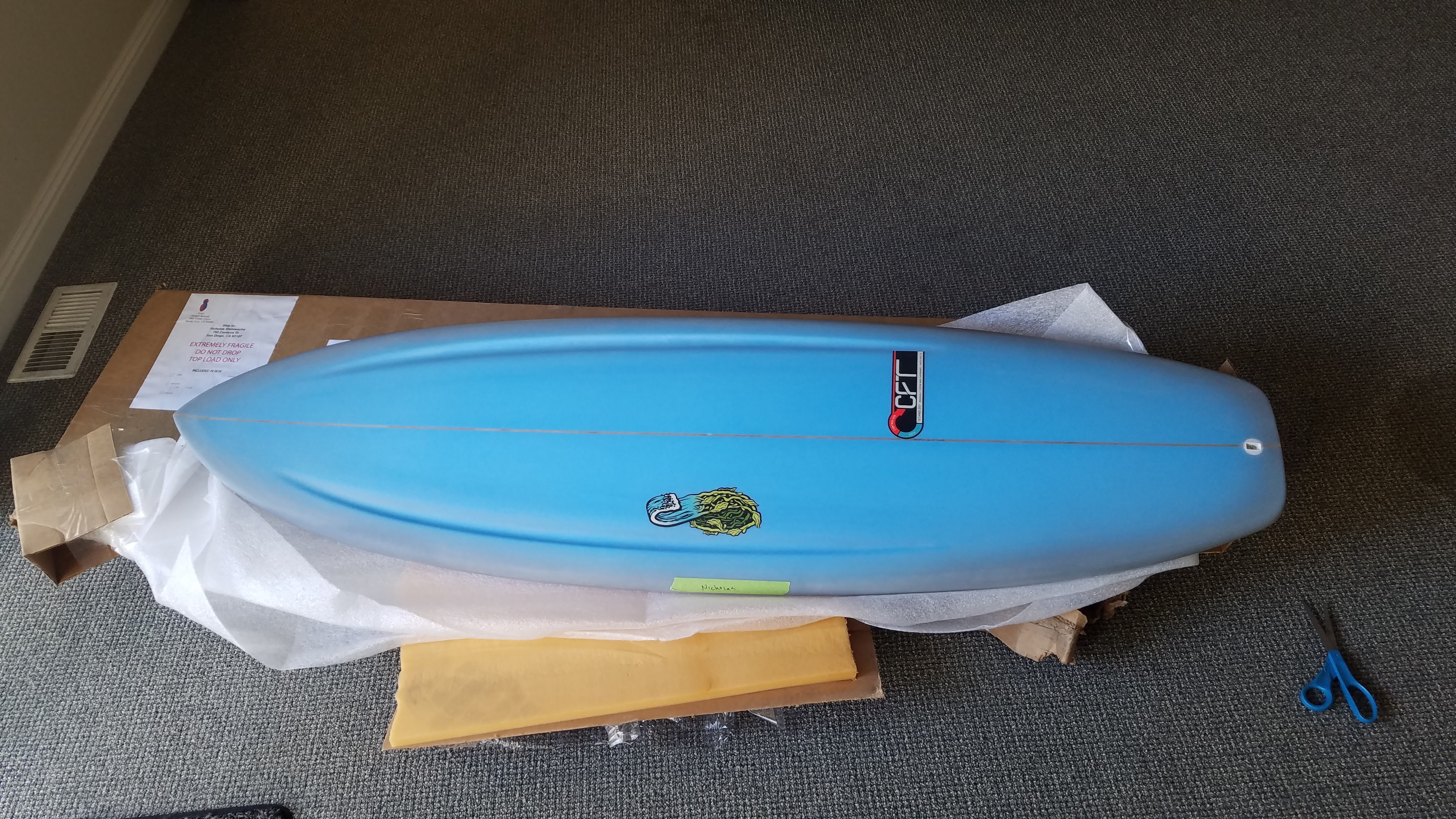 Öffentlich DepositedPhotographs of a custom Stretch Super Buzz Surfboard Dimensions: 5'6" L x 19" W x 2.2" T Fins: FCS Fin Setup: 5-fin